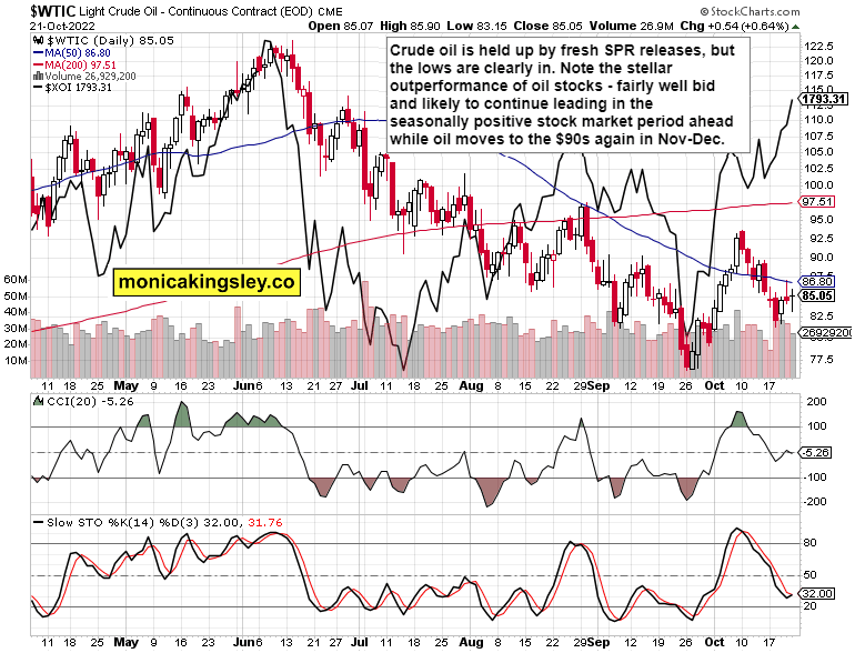 Crude oil is well bid, won‘t decline more no matter what‘s going on with the SPR. Oil stocks outperformance demonstrates that beneath the surface, all is well for crude oil investors – the era of constricted supply will be increasingly more having the upper hand over the quarters and years ahead as exploration and drilling are lagging behind, not to mention geopolitics.