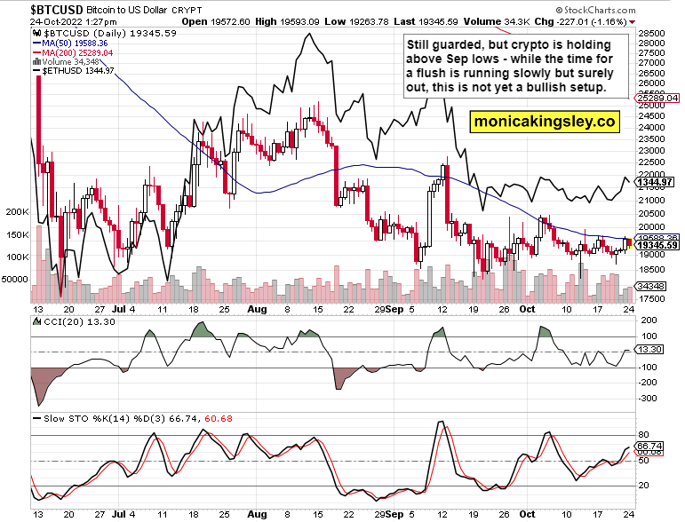 I‘m covering the impact on precious metals and commodities in the rich chart section – suffice to say that the former appear to have made quite a turn Friday while oil would keep grinding higher, and copper recovering while cryptos are to continues sideways for now. These moves are as much about the Fed and the dollar as about inflation whose core components aren‘t rolling over really.