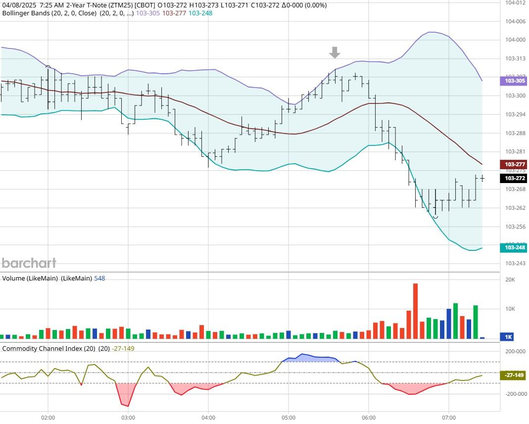 Yesterday the ZT dived Lower at around 6:35 AM EST with no economic news is sight. The Dow moved Higher at the same time. Look at the charts below and you'll see a pattern for both assets. The Dow moved Higher at 6:35 AM EST and the ZT moved Lower at around the same time. These charts represent the newest version of Bar Charts, and I've changed the timeframe to a 15-minute chart to display better. This represented a Short opportunity on the 2-year note, as a trader you could have netted about 30 plus ticks per contract on this trade. Each tick is worth $6.25. Please note: the front month for ZT is now Jun '25 and the Dow is Jun '25 as well. I've changed the format to filled Candlesticks (not hollow) such that it may be more apparent and visible.
