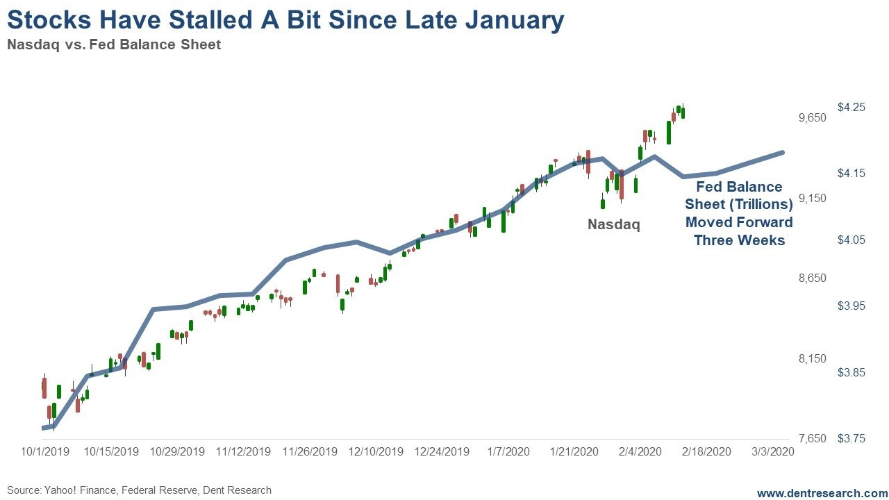 Here’s the new indicator that we update every Thursday evening for the net rise or fall in the Fed balance sheet and its close correlation with stocks on a lag. Stocks are now at the highest point — 9,748 on the Nasdaq recently — compared to this indicator that has been more sideways since it peaked at $424 billion.