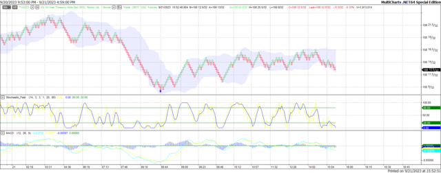 Yesterday the ZN migrated Higher at around 8:45 AM EST as the S&P hit a High at around the same time. If you look at the charts below the S&P gave a signal at around 8:45 AM and the ZN started its Upward ascend. Look at the charts below and you'll see a pattern for both assets. S&P hit a High at around 8:45 AM and migrated Lower. These charts represent the newest version of MultiCharts and I've changed the timeframe to a 15-minute chart to display better. This represented a Long opportunity on the 10-year note, as a trader you could have netted about 20 plus ticks per contract on this trade. Each tick is worth $15.625. Please note: the front month for the ZN is now Dec '23. The S&P contract is now Dec' 23. I've changed the format to filled Candlesticks (not hollow) such that it may be more apparent and visible.