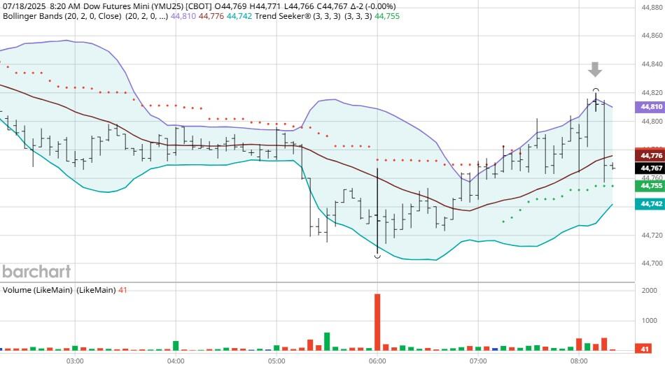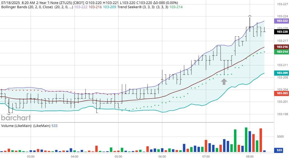 On Friday the ZT climbed Higher at around 8:30 AM EST with various reports pending. The Dow dived Lower at the same time. Look at the charts below and you'll see a pattern for both assets. The Dow dived Lower at 8:30 AM EST and the ZT climbed Higher at around the same time. These charts represent the newest version of Bar Charts, and I've changed the timeframe to a 15-minute chart to display better. This represented a Long opportunity on the 2-year note, as a trader you could have netted about 20 plus ticks per contract on this trade. Each tick is worth $6.25. Please note: the front month for ZT is now Sep '25 and the Dow is now Sep '25. I've changed the format to filled Candlesticks (not hollow) such that it may be more apparent and visible.