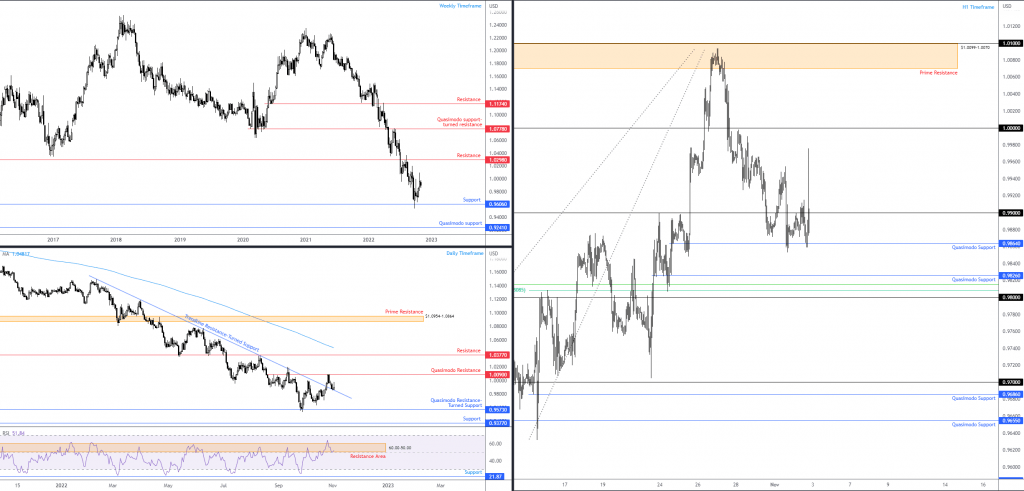 Daily trendline resistance-turned support on the daily timeframe, extended from the high of $1.1495, remains in the spotlight, evidently under pressure and on the verge of ceding ground. This follows last week’s rejection of daily Quasimodo resistance from $1.0090. Clearing the noted trendline support uncovers a familiar daily Quasimodo resistance-turned support coming in at $0.9753.