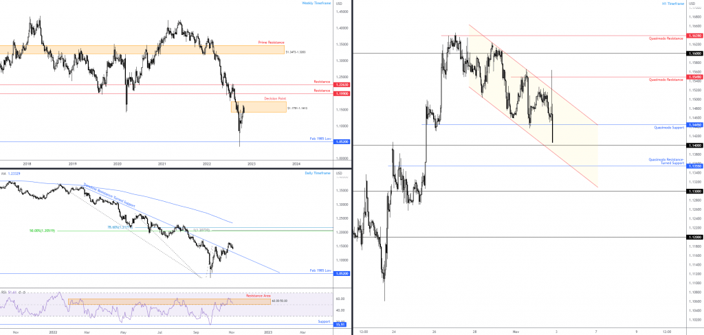 Technically speaking, recent downside should not be a surprise. The weekly timeframe has price action testing the inside of a decision point at $1.1751-1.1413, alongside the daily chart’s relative strength index (RSI) resistance between 60.00 and 50.00 welcoming the indicator. This is also supported by the dominant downtrend visible on the weekly timeframe since topping at $1.4250 in June 2021.