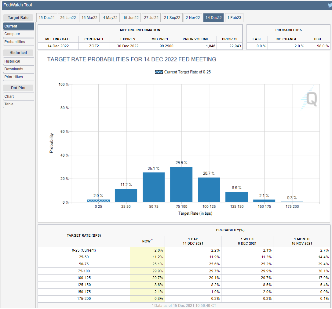 This is the simplest. The Fed governors are not expected to increase the US base rate which has been at a 0.25% upper target since March 2020. Until the original $120 billion a month in bond purchases, reduced by $15 billion in November, is ended, the Fed, by its own admission, will not alter the fed funds rate.
