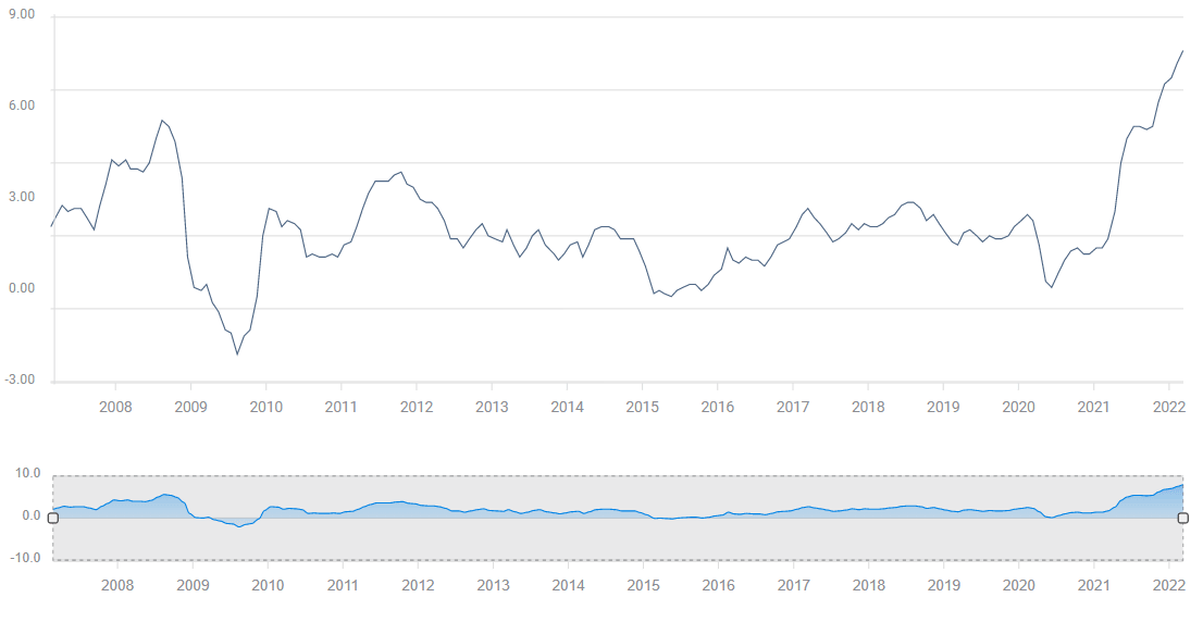Consumer price inflation soared 564% in 14 months, from 1.4% in January 2021 to 7.9% in February 2022. In the second half of last year, inflation became the main economic topic, as outsized increases in food, gasoline, cars and many other items, commandeered attention and converted the Fed in short order from apologist to first responder.
