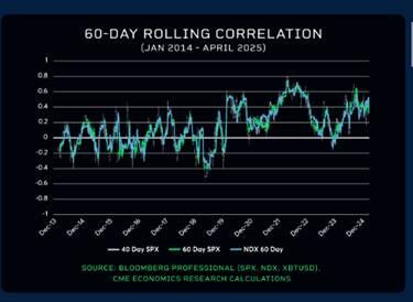 A CME article notes that bitcoin is acting like equities rather than a portfolio diversifier or alternative to gold. “In 2020, a significant shift occurred. The relationship between bitcoin and equities turned positive and has remained so over the past five years.” See the correlation chart. And the correlation becomes stronger in times of stress.