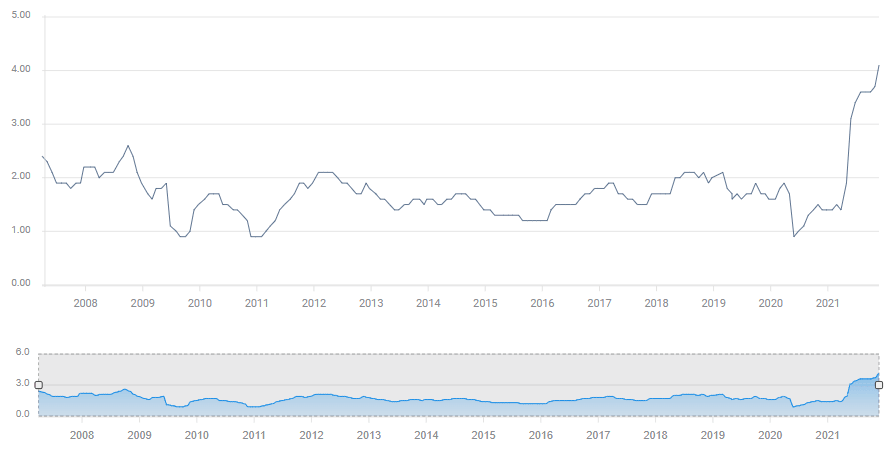 Back in November, the Fed announced it is tapering its bond-buying program of $120 billion per month by $15 billion. Investors expect the bank to double the pace to $30 billion. That would imply three more months of reductions to conclude the scheme as the Fed is on course to purchase $90 billion worth of assets in December.