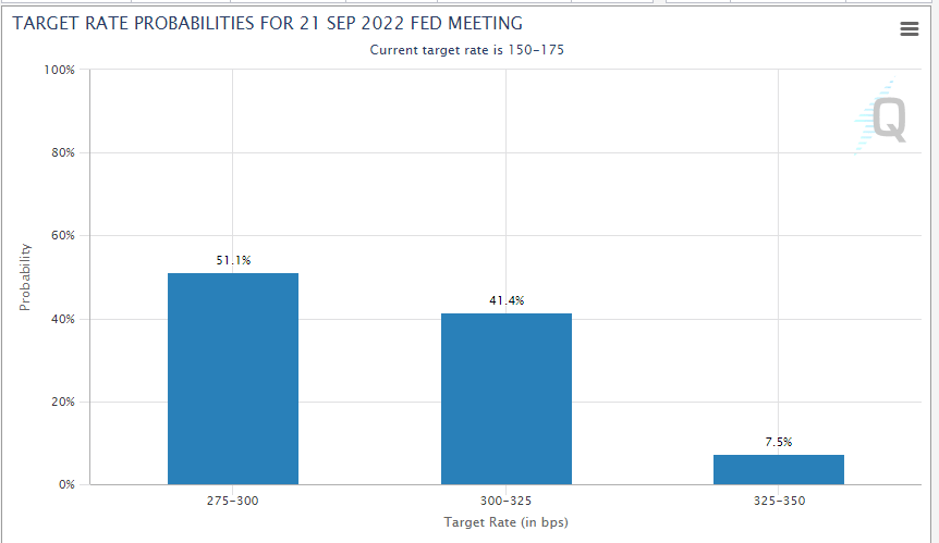 Powell may drop guidance for the next meeting altogether, or leave the door open for a third triple-dose hike of 75 bps. That is beyond current expectations, as reflected in bond markets. A 50 bps hike is priced for September 21, the next meeting.