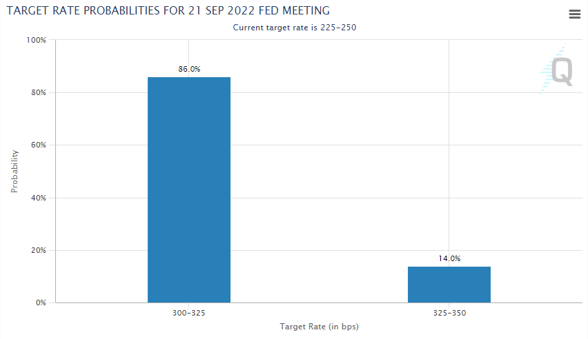 The US Federal Reserve is widely expected to hike its policy rate by 75 basis points (bps) to a range of between 3%-3.25% on Wednesday, September 21. The market positioning following the upbeat employment and stronger-than-expected Consumer Price Index (CPI) figures for August, however, suggests that there is a 14% probability of a 100 bps increase. The Fed will also release its updated Summary of Economic Projections (SEP), the so-called dot plot, alongside its policy statement.