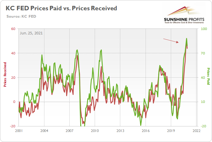 ”To that point, while the KC FED’s prices paid and prices received indexes declined slightly from their all-time highs, both gauges remain above their prior historical peaks.