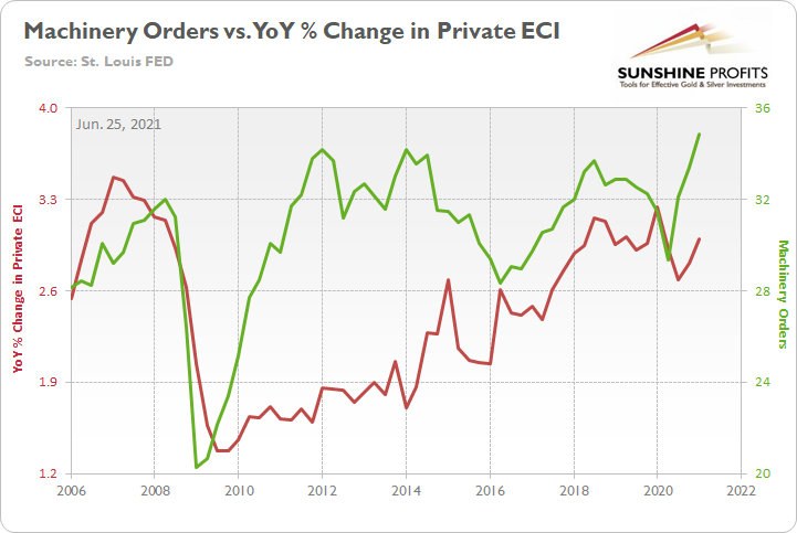 To explain, the green line above tracks manufacturers’ machinery orders, while the red line above tracks the YoY percentage change in the Private Employment Cost Index (ECI). If you analyze the relationship, you can see that when manufacturers invest in long-term equipment, wage inflation often follows. As a result, if the two lines continue their ascent, it will only increase the odds that the FED tapers in September. Forecasting more hawkish, not more dovish FED seems to be appropriate at this time.