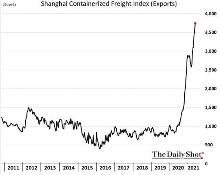 On top of that, with the U.S. goods trade balance (exports minus imports) revised to -$88.11 billion on Jun. 24, foreign production is required to stock U.S. shelves. And with the Shanghai Containerized Freight Index (the cost to ship from China) unrelenting in its parabolic rise, it’s another indicator that inflationary pressures are unlikely to abate anytime soon.