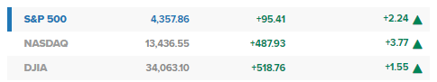 The three major US averages rebounded from their initial dips to close sharply higher.
