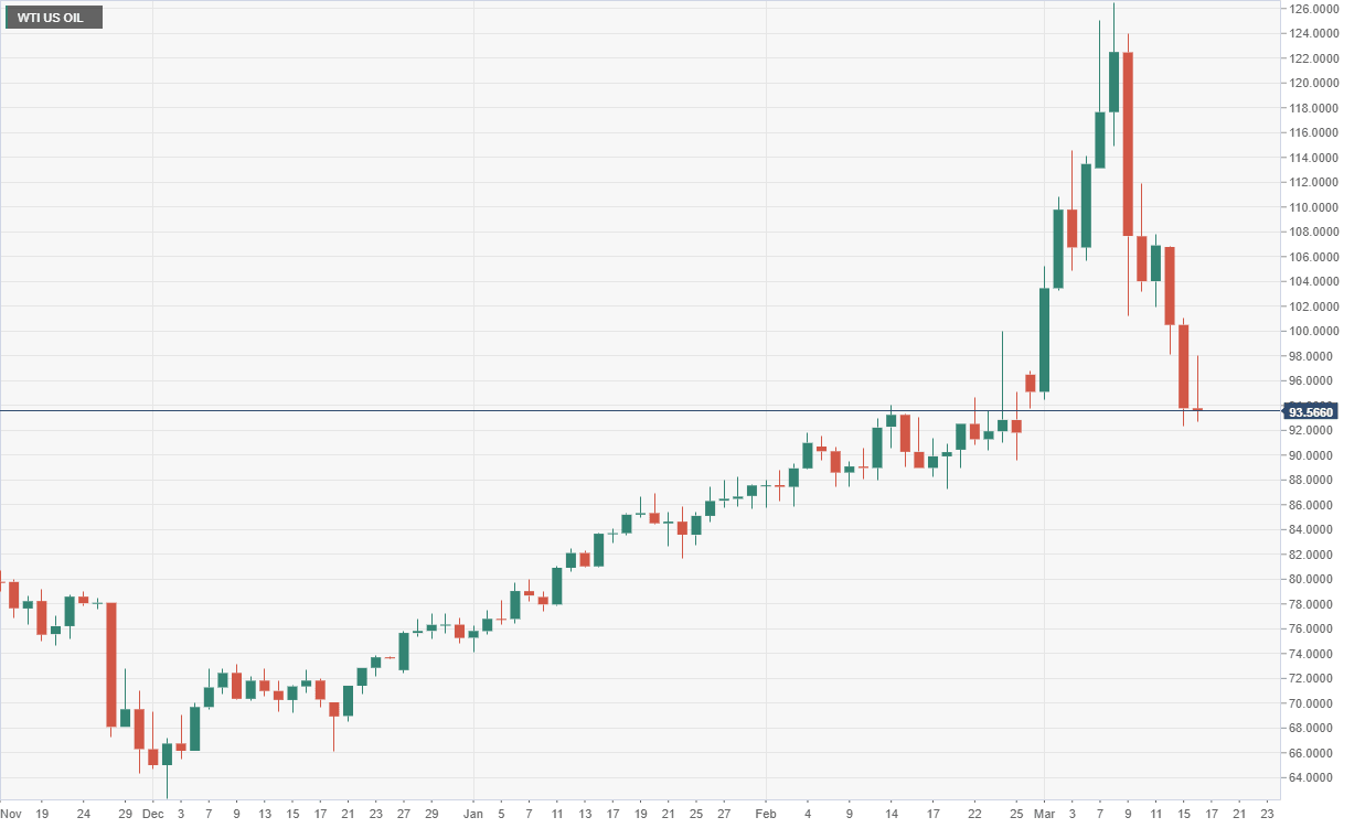 Oil and commodity prices were slightly lower on the day. West Texas Intermediate (WTI) has returned to its level just before the Russian invasion of Ukraine began on February 24.