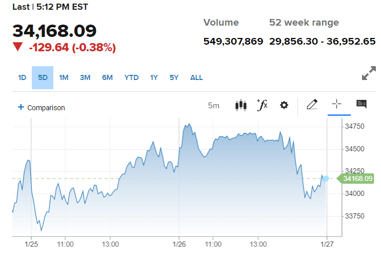 From a 2.2% gain before Mr. Powell began answering questions, the S&P 500 closed down 0.15% at 4,349.93. The Dow had been ahead 1.5% at 34,815.82, but finished off 129.64 points, 0.38% at 34,168.08. The NASDAQ composite shed its 3.4%, 463.36 point gain to conclude flat at 13,542.12, up 2.82 points.