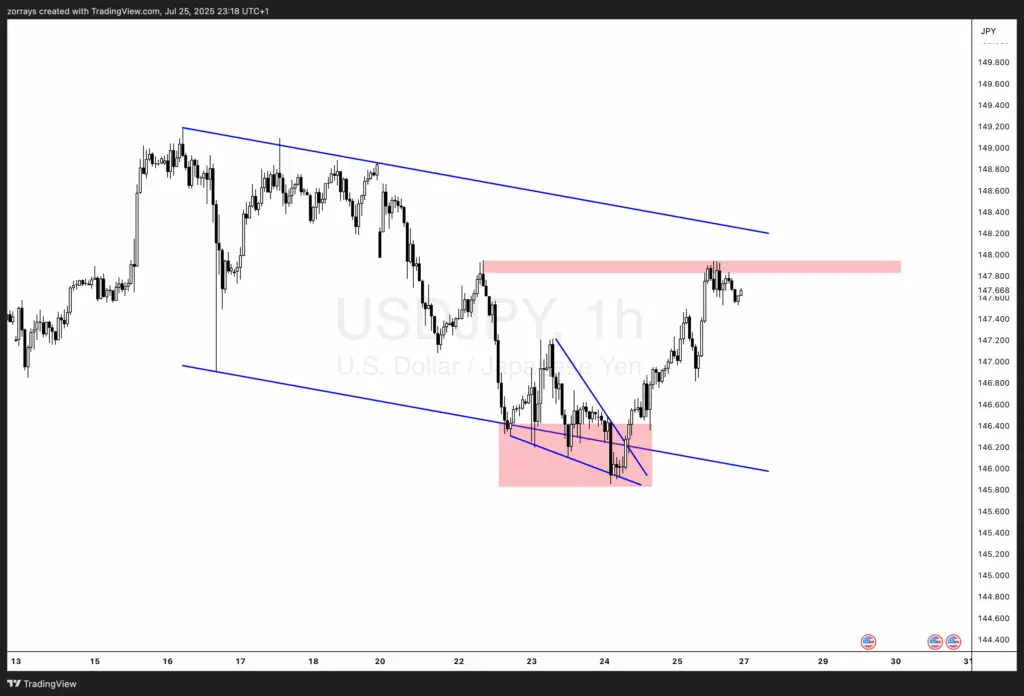 We tweeted this setup right from the bottom of the flag formation, and price action has played out beautifully. After breaking out of the falling wedge, USDJPY surged higher and is now stalling just below the key resistance zone around 147.900. This area has acted as a short-term cap, but momentum remains strong. If bulls manage to break and close above this key level, we could see continued upside towards the upper boundary of the descending channel, possibly eyeing a move back toward 148.50 and beyond. Keep an eye on a confirmed breakout for bullish continuation.