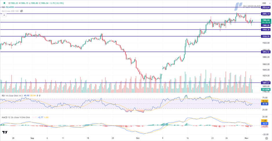 Gold prices experienced a slight rebound from a pivotal support level at $1980, particularly due to the decline in two-year US Treasury yields following the Federal Reserve's decision to maintain interest rates. The economic data from the US exhibited a mixed picture. On the downside, ADP Nonfarm Employment Change for October and ISM Manufacturing PMI for October fell short of expectations at 113K and 46.7, respectively, compared to the anticipated figures of 150K and 49. In contrast, ISM Manufacturing Prices and JOLTs Job Openings outperformed market expectations.