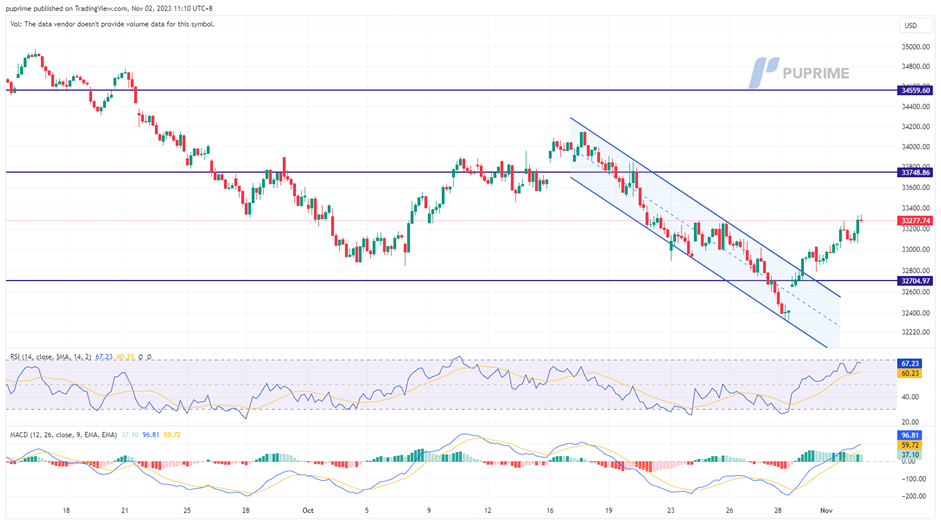 The Dow sustained after it broke above the downtrend channel, suggesting a solid trend reversal signal for the index. The RSI is heading toward the overbought zone while the MACD is on the brink of breaking above the zero line, suggesting the bullish momentum is gaining.