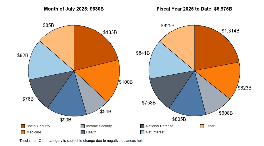 So far, in fiscal 2025, the federal government has spent more on interest on the debt than it has on national defense ($758 billion) or Medicare ($823 billion). The only higher spending category is Social Security ($1.31 trillion).