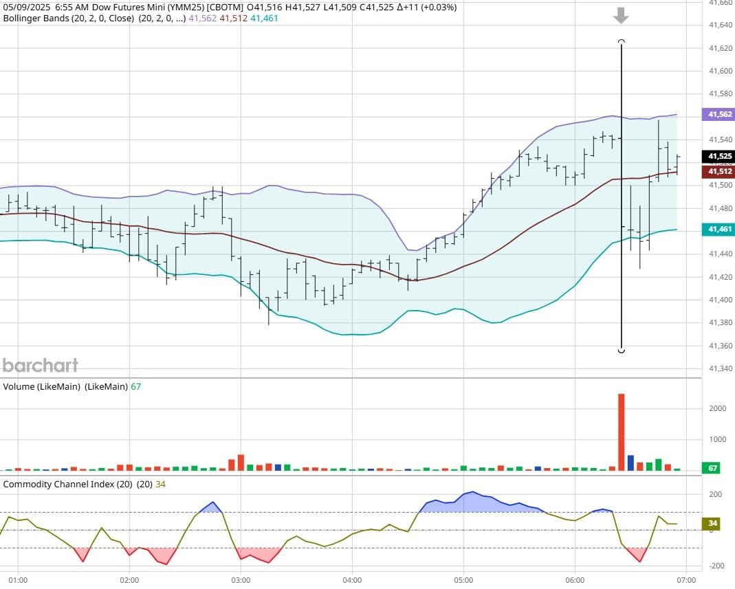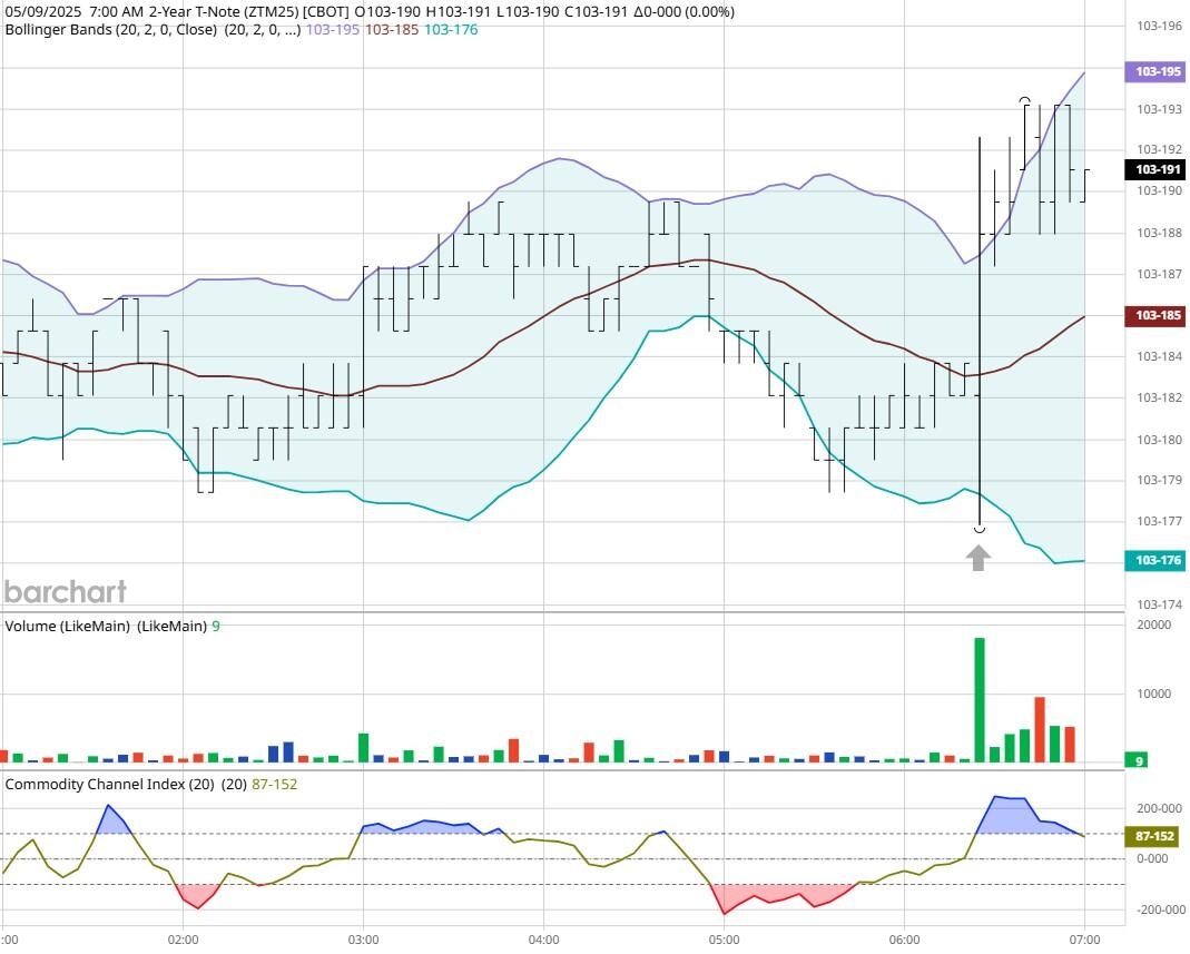 On Friday the ZT climbed Higher at around 8:30 AM EST with no economic news pending. The Dow dropped Lower at the same time. Look at the charts below and you'll see a pattern for both assets. The Dow moved Lower at 8:30 AM EST and the ZT moved Higher at around the same time. These charts represent the newest version of Bar Charts, and I've changed the timeframe to a 15-minute chart to display better. This represented a Long opportunity on the 2-year note, as a trader you could have netted a dozen plus ticks per contract on this trade. Each tick is worth $6.25. Please note: the front month for ZT is now Jun '25 and the Dow is Jun '25 as well. I've changed the format to filled Candlesticks (not hollow) such that it may be more apparent and visible.