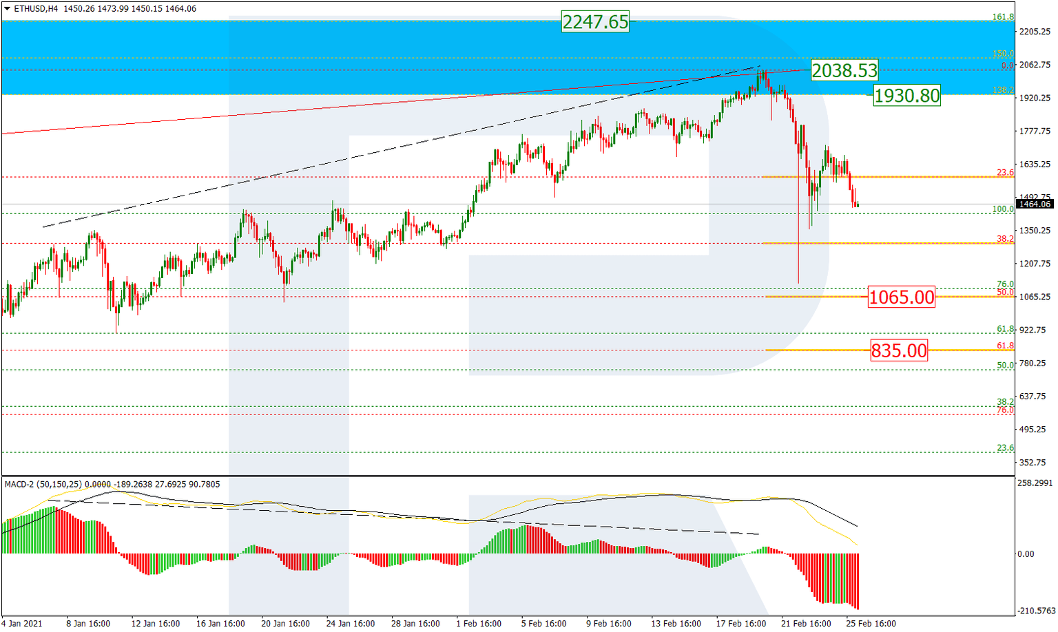 In the H4 chart, after testing the post-correctional extension area between 138.2% and 161.8% fibo at 1930.80 and 2247.65 respectively, ETHUSD started plunging due to divergence on MACD. The first descending impulse broke 38.2% fibo but failed to reach 50.0% fibo at 1065.00. the current situation may be described as a correction within a correction. Possibly, the pair may complete the internal correction and resume falling to reach 61.8% fibo at 835.00. The key resistance is the high at 2038.53.