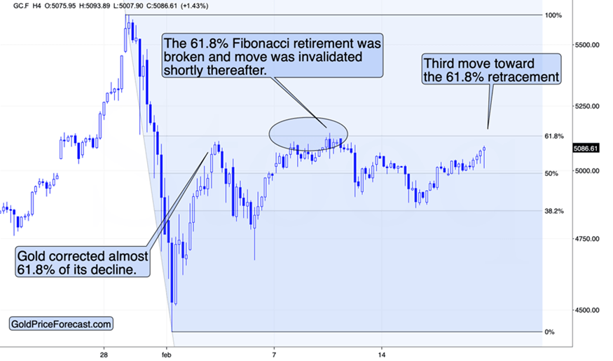 Gold is re-testing its 61.8% Fibonacci retracement once again instead of declining.