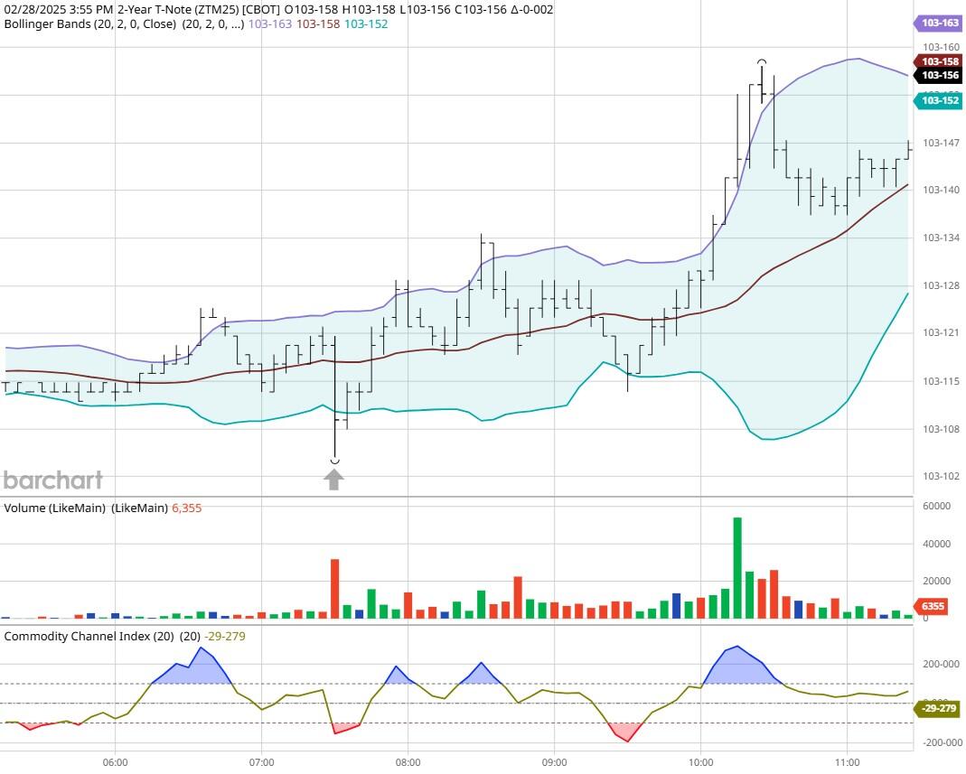 On Friday the ZT Migrated Higher at around 8:30 AM EST as the 8:30 AM news was reported. The Dow moved Lower at the same time. Look at the charts below and you'll see a pattern for both assets. The Dow moved Lower at 8 AM EST and the ZT moved Higher at around the same time. These charts represent the newest version of Bar Charts, and I've changed the timeframe to a 15-minute chart to display better. This represented a Long opportunity on the 2-year note, as a trader you could have netted about 20 plus ticks per contract on this trade. Each tick is worth $7.625. Please note: the front month for ZT is now Jun '25 and the Dow is still Mar '25. I've changed the format to filled Candlesticks (not hollow) such that it may be more apparent and visible.