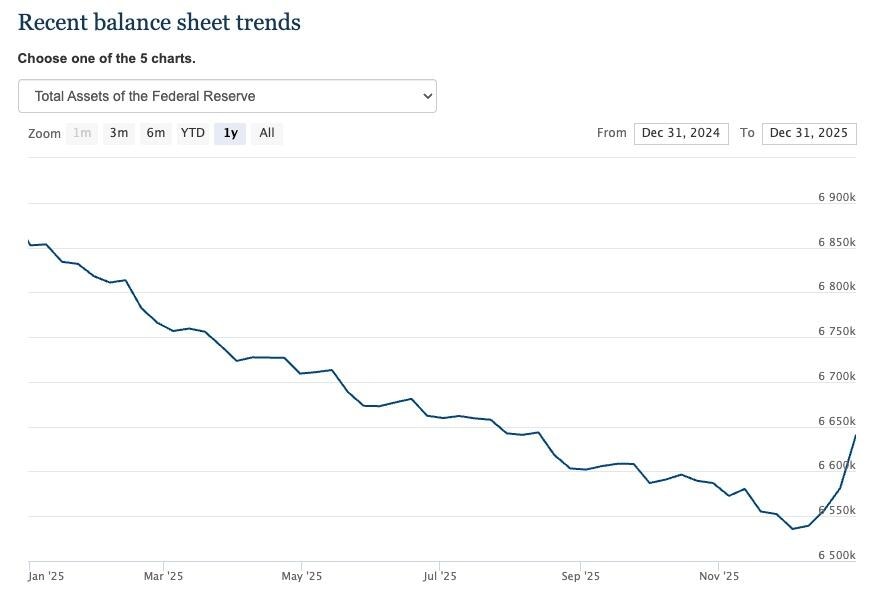The Fed’s balance sheet bottomed on December 3 at $6.54 trillion. At its December meeting on Wednesday, December 10, the Fed announced that it would purchase $40 million in Treasury Bills on Friday (Bills are short-term Treasuries that mature in one year or less). From that point, purchases will “remain elevated for a few months” before they are “significantly reduced.”