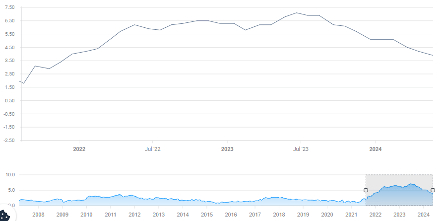 While that is almost in line with the central bank's 2% target, the data came out above expectations. Another small decline is on the cards now. Investors will be watching the more stubborn core CPI, which was at 3.9% last month and is now expected to drop to 3.5%.