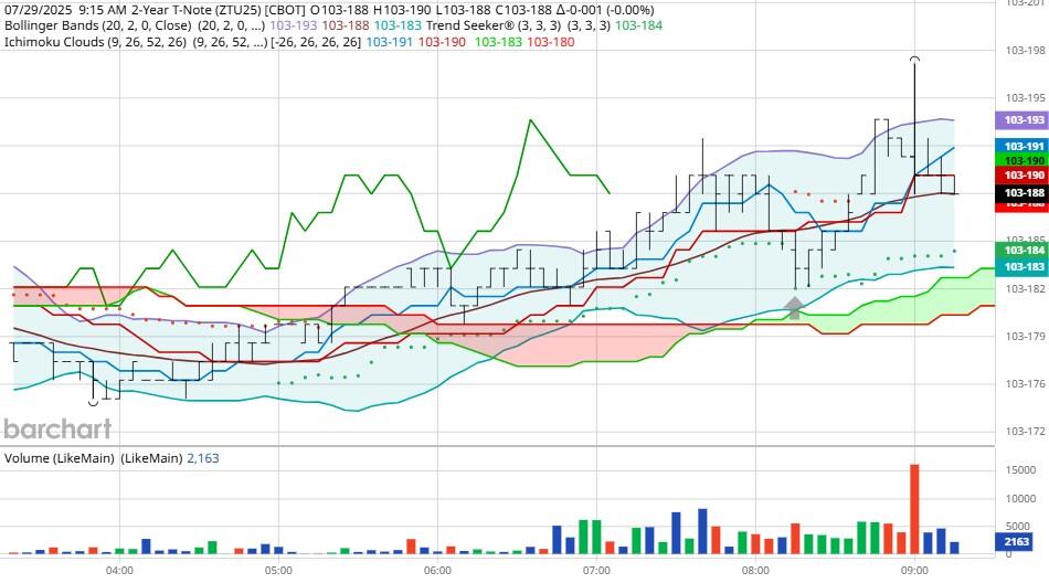 Yesterday the ZT climbed Higher at around 8:15 AM EST with no news pending. The Dow dived Lower at the same time. Look at the charts below and you'll see a pattern for both assets. The Dow dived Lower at 8:15 AM EST and the ZT climbed Higher at around the same time. These charts represent the newest version of Bar Charts, and I've changed the timeframe to a 15-minute chart to display better. This represented a Long opportunity on the 2-year note, as a trader you could have netted about a dozen plus ticks per contract on this trade. Each tick is worth $6.25. Please note: the front month for ZT is now Sep '25 and the Dow is now Sep '25. I've changed the format to filled Candlesticks (not hollow) such that it may be more apparent and visible.