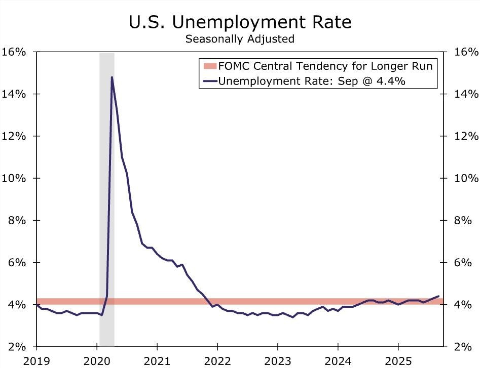 Our base case remains that the current easing cycle is not over yet but rather that it is entering a slower phase. While the labor market is far from collapsing, the softening in conditions to the wrong side of "maximum employment" supports policy returning to a more neutral position. Directional progress on inflation next year should resume as the initial lift from tariffs fade, which would reduce the tension between the FOMC's employment and inflation mandate. We continue to look for two 25 bps rate cuts next year at the March and June meetings. Next week's economic data, specifically the "one and a half" employment report on Tuesday and the November CPI on Thursday, will be key to the outlook. We will have reports out previewing these data releases in the coming days.