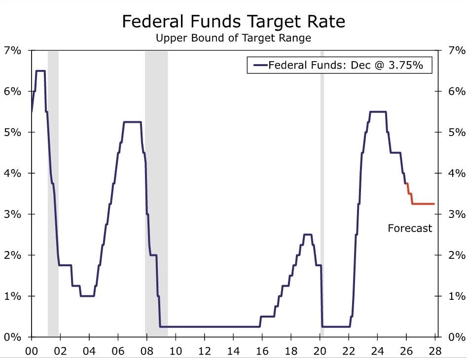 - There is a slew of economic data between now and the next meeting on January 28, and we will be monitoring it closely and adjusting our forecast as conditions warrant. Our base case remains that the current easing cycle is not over yet but rather that it is entering a slower phase. We continue to look for two more 25 bps cuts from the FOMC next year at the March and June meetings.