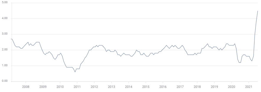 The Consumer Price Index (CPI) has more than tripled in six months from 1.4% in January to 5.4% in June. Even the Fed's preferred Personal Consumption Expenditure Price Index (PCE) has more than doubled from 1.5% in January to 3.4% in May. It is expected to rise to 3.7% in June when it is released by the Bureau of Economic Analysis on Friday. If accurate, it would be the highest core inflation rate in more than three decades, since March 1991.