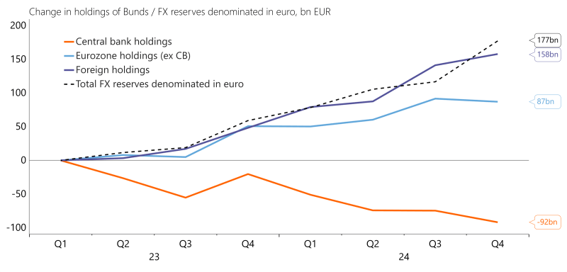 An important factor in the Bund’s popularity among foreign investors relates to its safe asset characteristics. FX reserve managers, for instance, are often guided by mandates that limit the investible universe to the highest credit quality. As the chart above shows, the holdings of euro-denominated assets by global FX reserves rose by around €180bn over the same period, which is similar in magnitude to the change in the foreign holdings of Bunds. In an earlier note, we indicated that by historical standards, EUR-denominated assets are still underallocated by up to €450bn. The de-dollarisation theme could help swing the balance in favour of the euro.