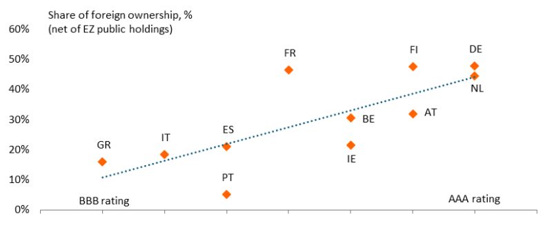 A review of foreign ownership of eurozone government bonds confirms that those with high credit ratings are particularly popular. Greece, Italy, and Spain have around half the foreign interest compared to the AAA-rated countries. France is an outlier here, but this can be explained by the size of the market and the high liquidity it provides on the back of an OAT futures market. A healthy futures market makes risk management around the holding of OATs easier.
