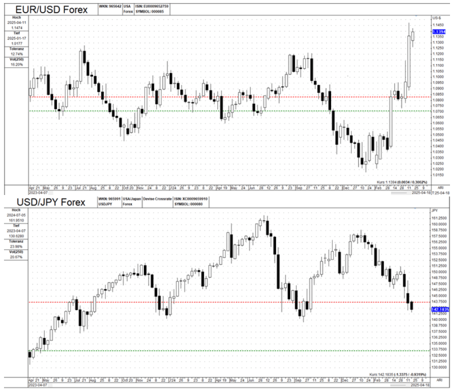 The provided document contains weekly charts for five major currency pairs: USD/JPY, NZD/USD, GBP/USD, EUR/USD, and AUD/USD. Each pair is represented by two chart types:
