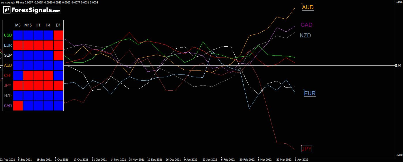 Look at the momentum meter chart below. I have set this to the daily time frame — any currency above the line is deemed to be strong and below weak! Also, note the trajectory of the lines. At the top, we see the AUD, CAD, and NZD almost at a 45-degree angle pointing up. Below, we see the 45-degree angle of the downward sloping JPY; the Euro has been trading with the same negative bias.