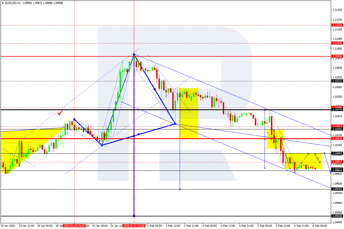 After reaching 1.1022 and forming another consolidation range, EUR/USD has broken it to the downside. Possibly, the pair may form a new descending structure towards 1.0978 and then start another correction to return to 1.1022.