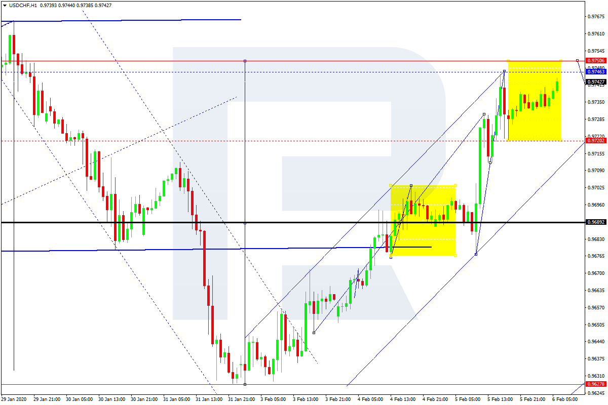USD/CHF is moving upwards. Possibly, today the pair may reach 0.9750 and then start another correction to break 0.9720. Later, the market may resume trading inside the downtrend with the target at 0.9690.