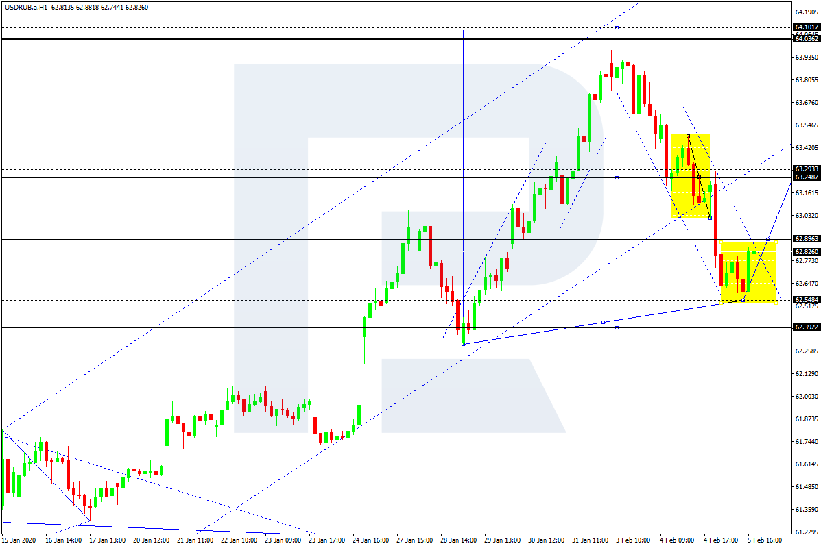 USD/RUB has finished the descending wave at 62.55. Possibly, today the pair may correct to reach 63.25 and then form a new descending structure with the target at 62.20.