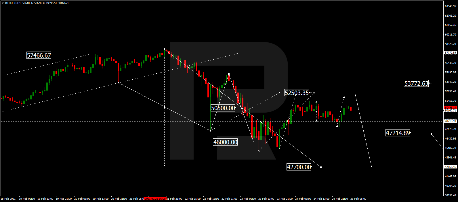 BTCUSD is still consolidating below 50500.00. Possibly, the asset may grow and expand the range up to 52500.00. Later, the market may form a new descending structure with the first target at 42700.00.