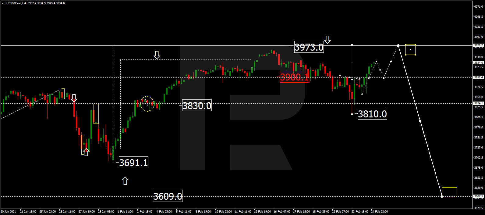 After finishing the correctional structure at 3856.0, the S&P index has broken 3897.4 to the upside; right now, it is growing to reach 3937.0. After that, the instrument may correct to test 3897.4 from above and then resume trading upwards with the target at 3973.0.