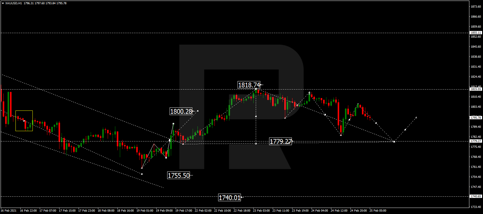 Gold is still falling towards 1779.27 and may later start a new growth to reach 1796.85. After that, the instrument may form a new descending structure with the target at 1750.00.