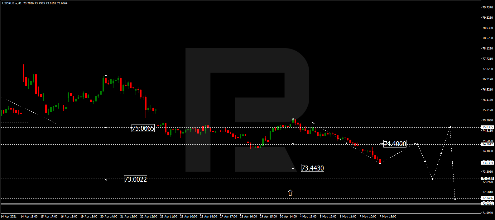 USD/RUB has completed the descending wave at 73.44 and may later correct towards 74.40. After that, the instrument may resume trading downwards with the target at 73.00.