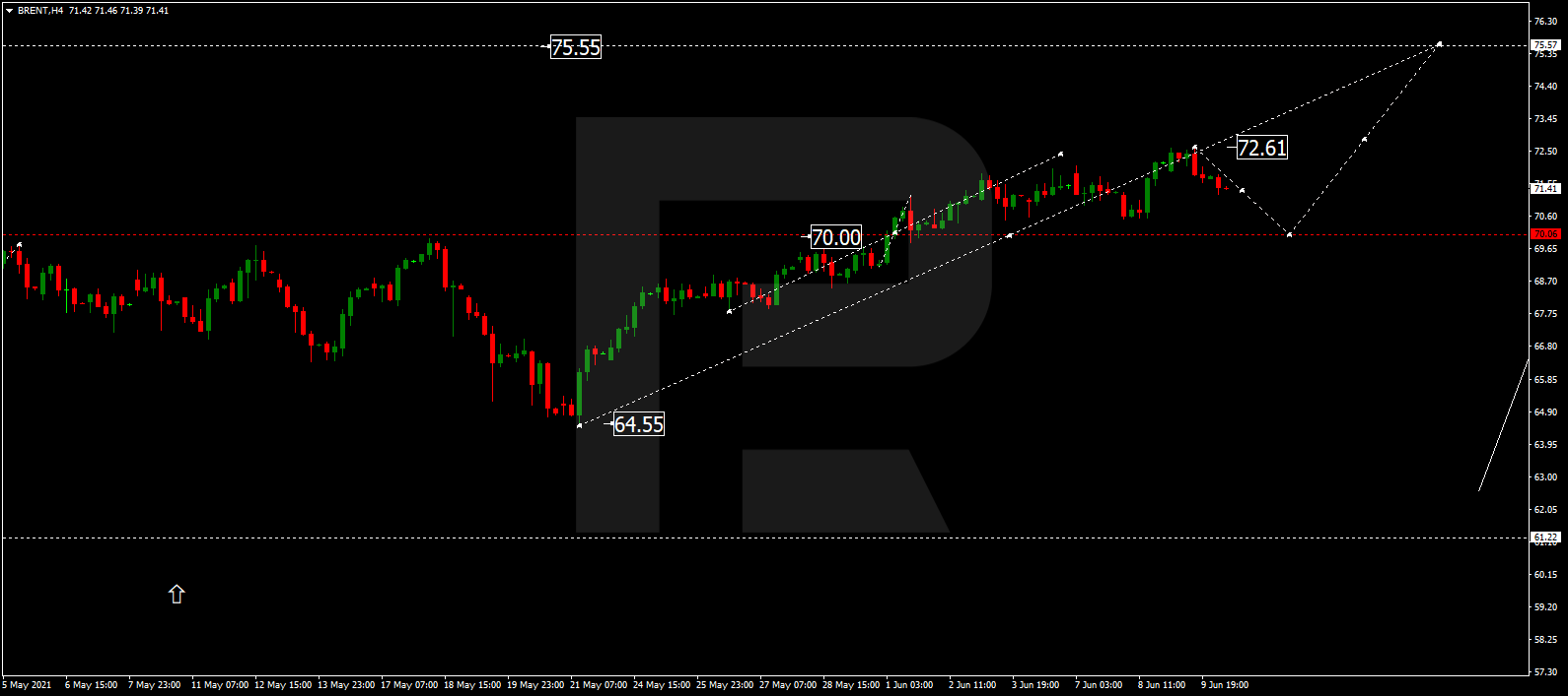 Brent has expanded the range up to 72.61. Possibly, today the asset may correct towards 70.00 and then resume trading upwards with the short-term target at 75.55. After that, the instrument may start a new correction to reach 70.00.