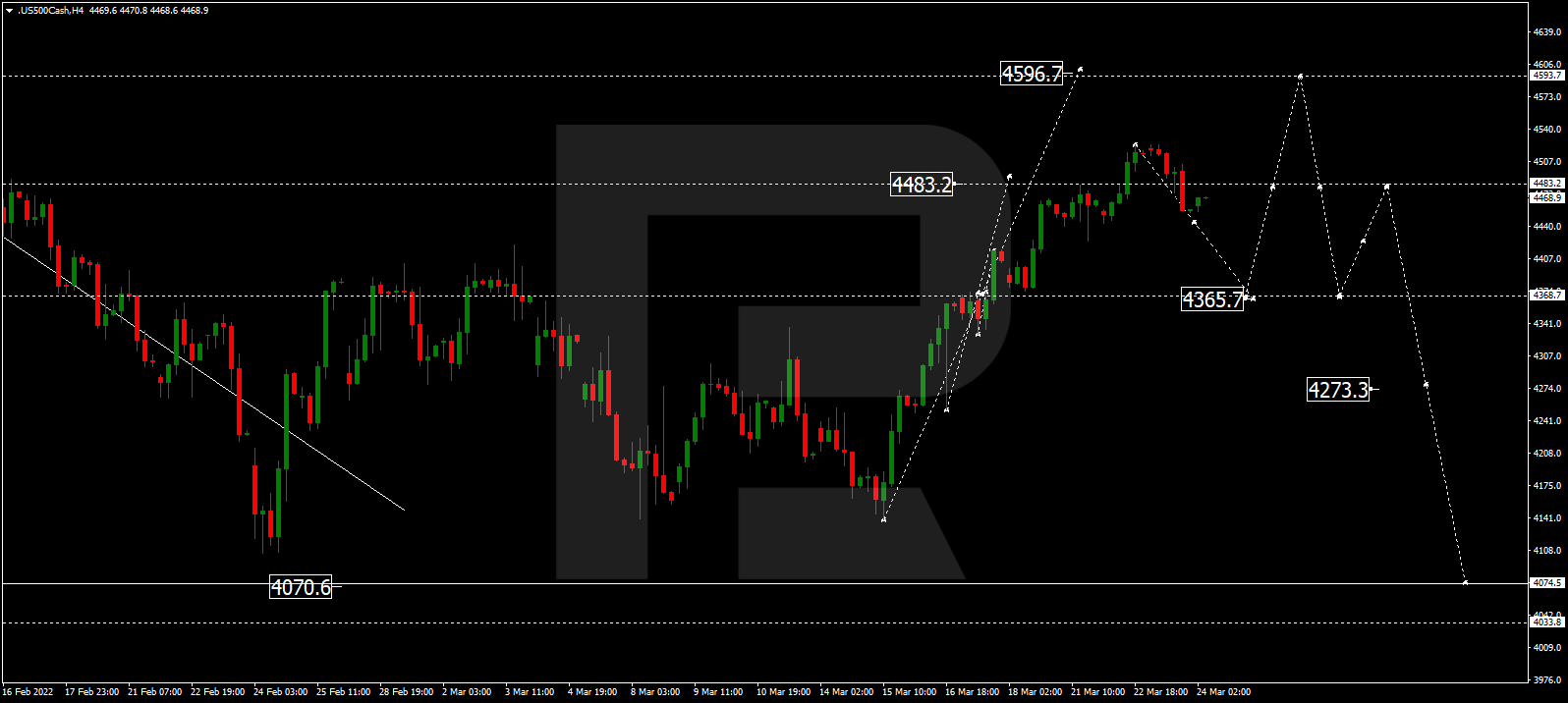 Having completed the ascending structure at 4500.0, the S&P index is expected to fall towards 4365.5 and may later start a new decline to break 4365.7. After that, the instrument may continue moving within the downtrend with the target at 4070.0.