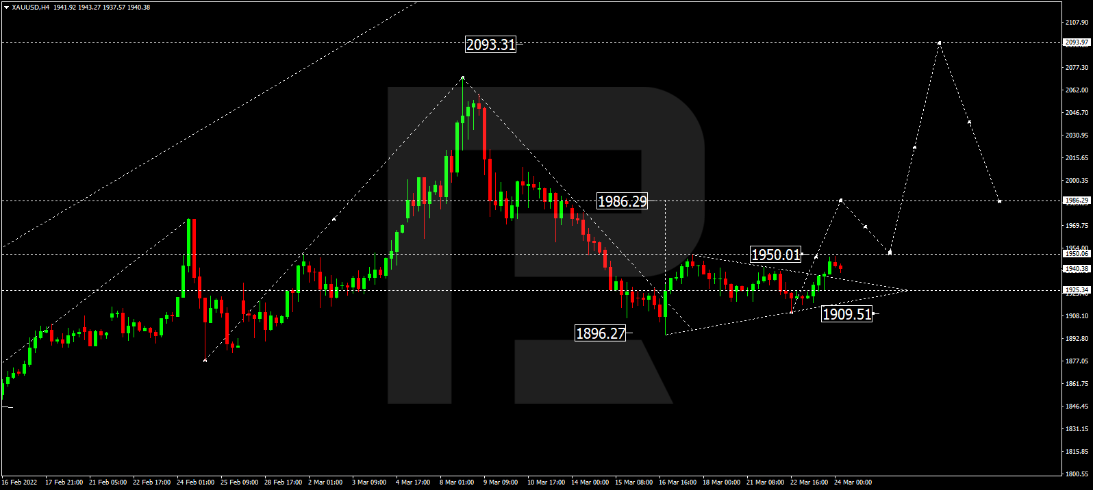 Gold has formed a new consolidation range around 1925.35. Possibly, today the metal may grow to break 1950.00 and then continue trading upwards with the first target at 1986.30.