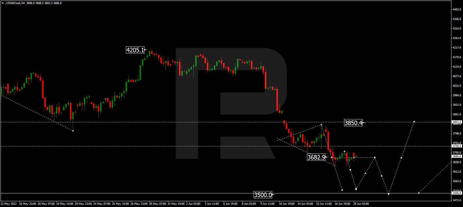 The stock index completed another declining wave to 3682.9. Today the market is forming a consolidation range around this level. A decline to 3500.0 is expected, followed by growth to 3850.0.