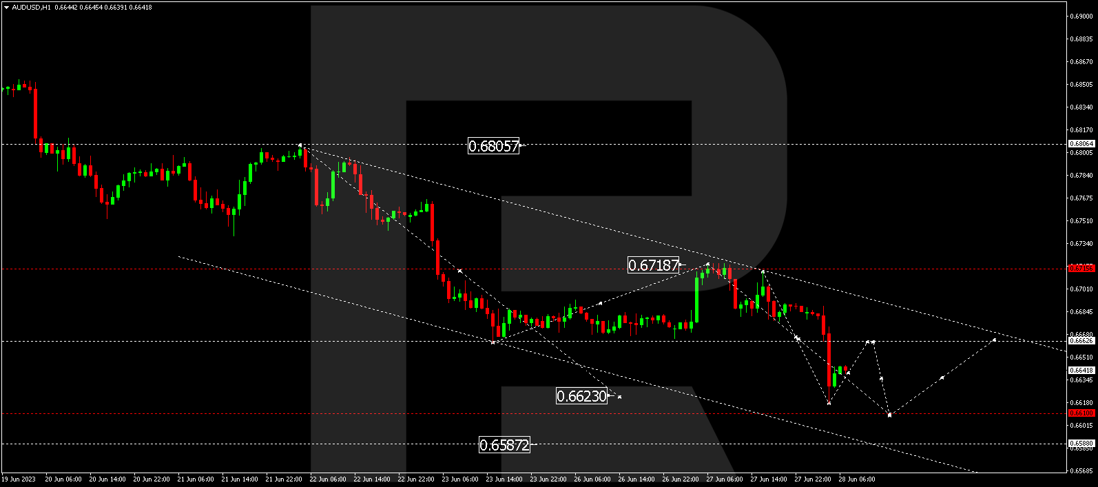 The currency pair has broken the level of 0.6666 downwards, completing a wave of decline to 0.6620. A link of correction to 0.6666 is not excluded today (a test from below). Next, the trend might continue downwards to 0.6610, from where the trend could continue to 0.6588.